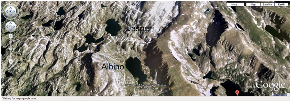 Figure 7. Google Earth image of Jasper (glacially fed) and Albino (snow fed) lakes. These lakes are showing differences in phytoplankton community form and function even given the close proximity.